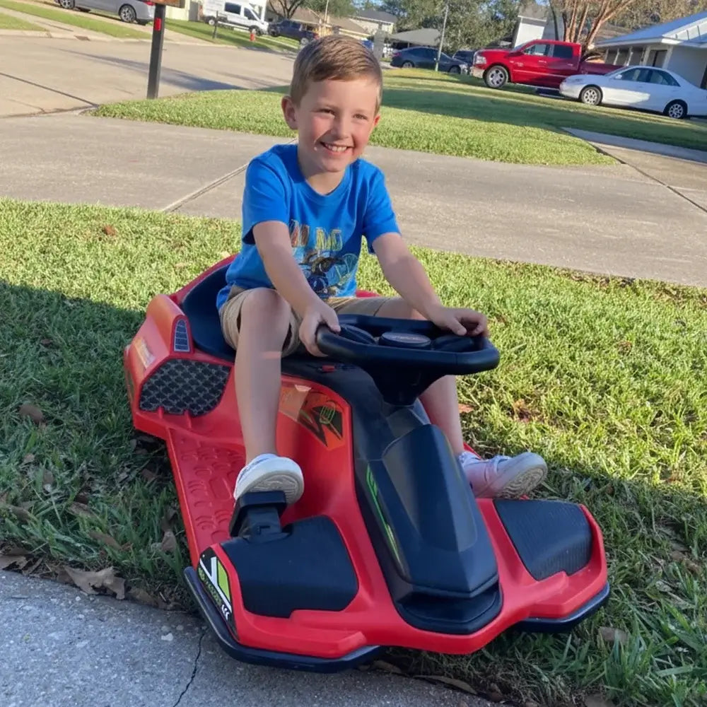 Our patented configuration featuring one drive wheel, two rear universal wheels, and two anti-tip front wheels that keeps the car stable during even the most extreme 360° spins, so kids can focus on fun instead of falls.